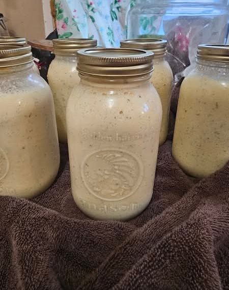 āCanned Alfredo sauce, all of āem sealed. 1 lb butter, 1 cup minced garlic, 1 gallon whole milk, 2 liters whipping cream, 2 lb shredded Parmesan, 2 lb shredded mozzarella, ½ cup chicken powder, 2 tb black pepper, ½ cup dried parsley, 1 tsp nutmeg. Pressure canning 15 min at your PSI.ā