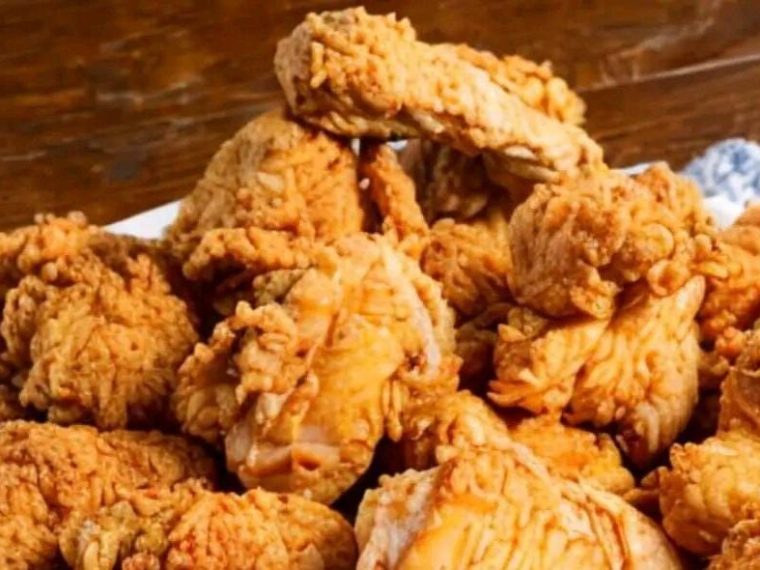 Transfer the fried chicken to a wire rack set over a baking sheet to allow excess oil to drain.