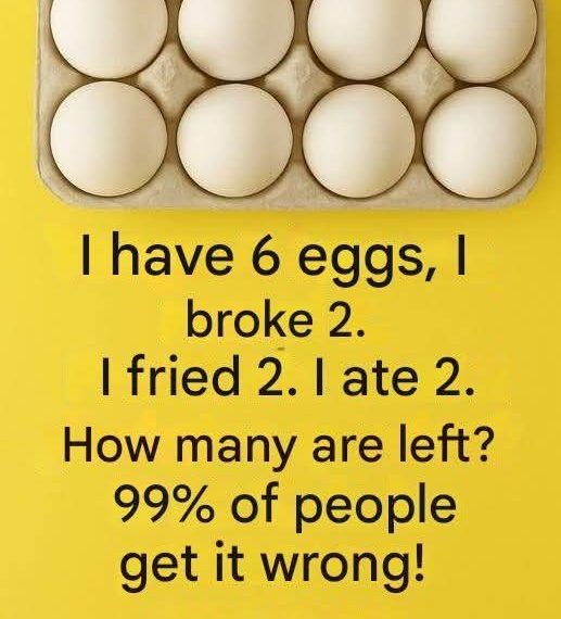 “I have 6 eggs. I broke 2. I fried 2. I ate 2. How many eggs do I have left?”