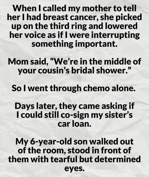 I went through cancer alone while my family ignored me. Now they want me to co-sign a loan, but my 6-year-old son just came out with something that silenced them.