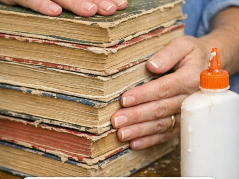 Place another book on top, pressing down firmly to ensure a strong bond. Wipe away any excess glue that seeps out.