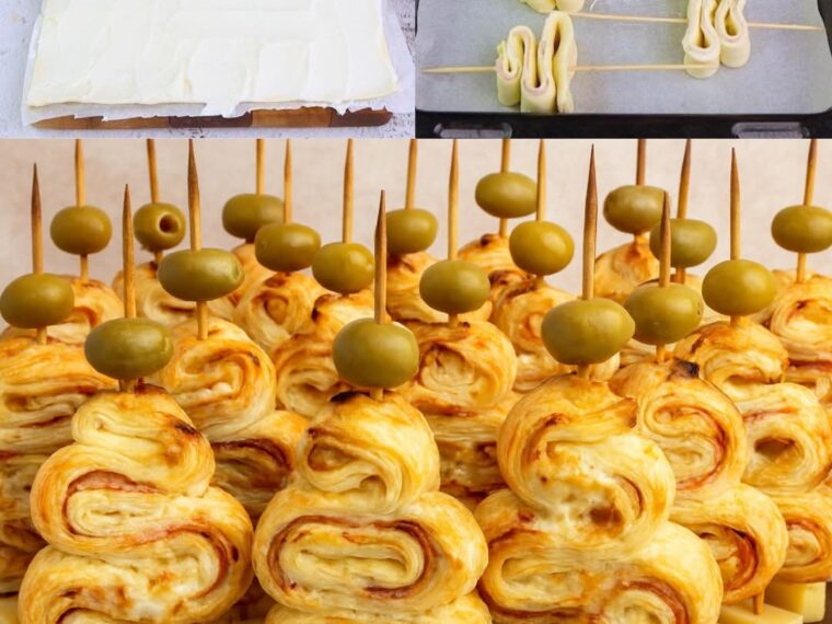 To make it, you will need a roll of puff pastry, cream cheese, ham, cheese, and olives. Unroll the pastry, cover it with cream cheese and ham, and bake until golden. It’s so easy to make—with a little effort, you can make an impressive appetizer that will wow your guests!