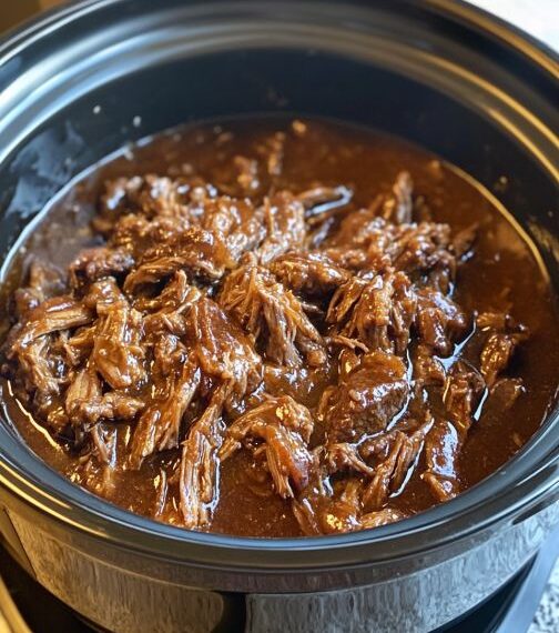Once cooked, shred the beef using two forks and mix it with the sauce in the slow cooker before serving.