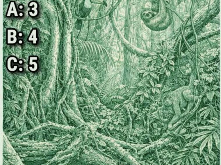 At first glance, this dense green jungle illustration looks like an ordinary forest scene. Thick tree roots twist across the ground, vines hang from branches, and layers of leaves create a rich canopy of texture. But hidden within the image are several animals camouflaged in the foliage.
